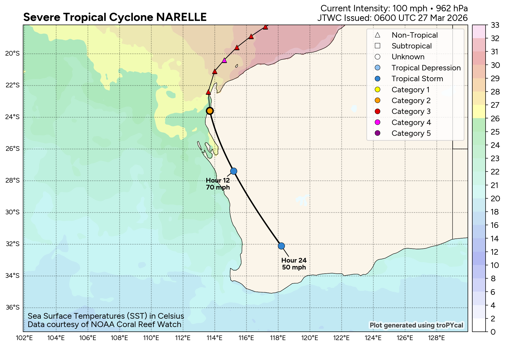 This page displays active tropical cyclones and invests, updated automatically using the Tropycal python package. Data is available courtesy of