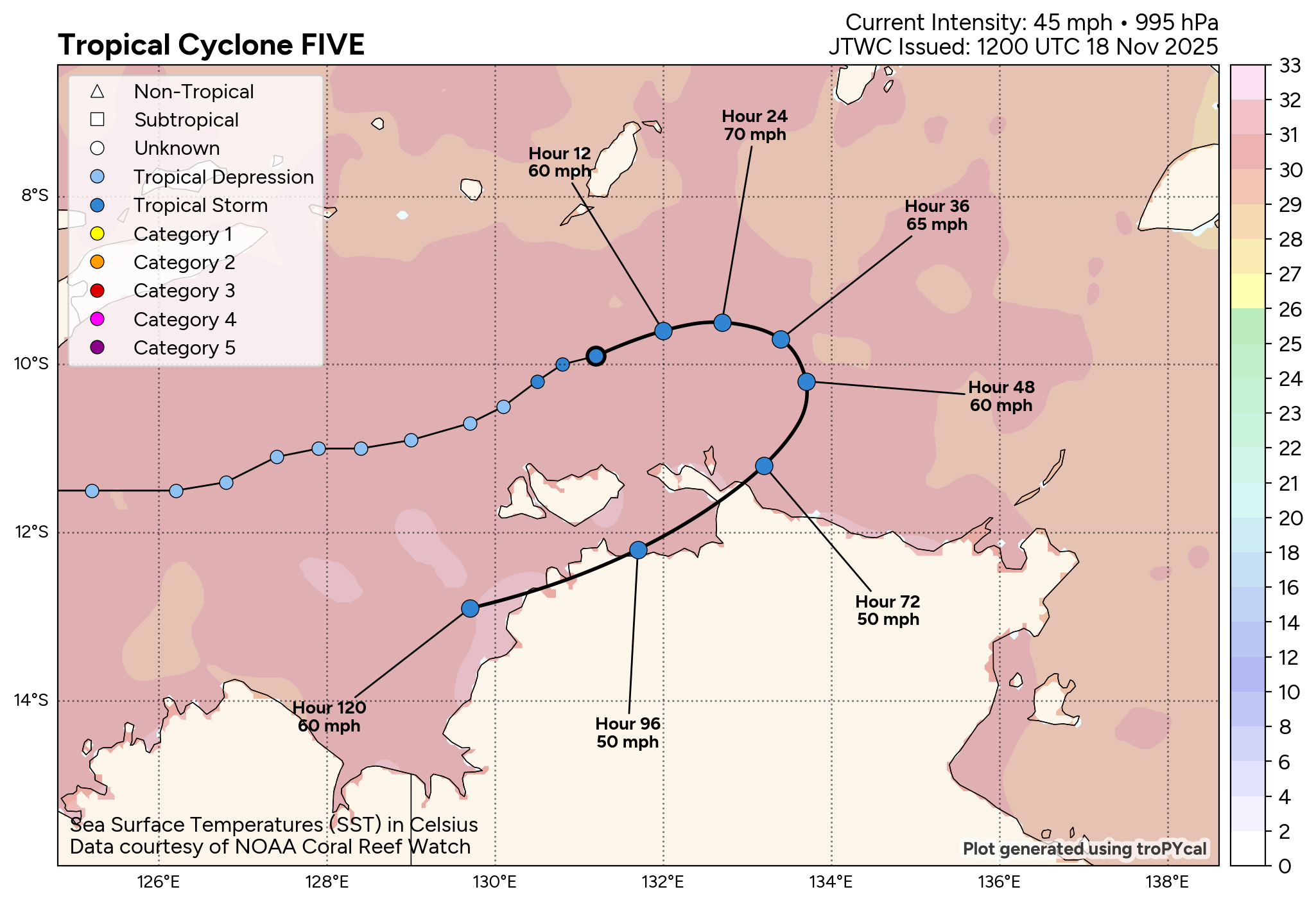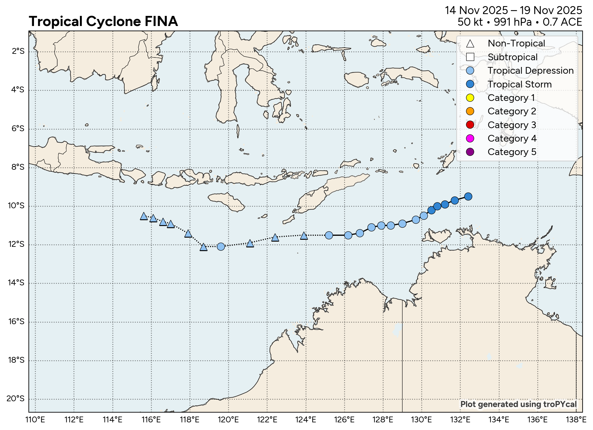 This page displays active tropical cyclones and invests, updated automatically using the Tropycal python package. Data is available courtesy of