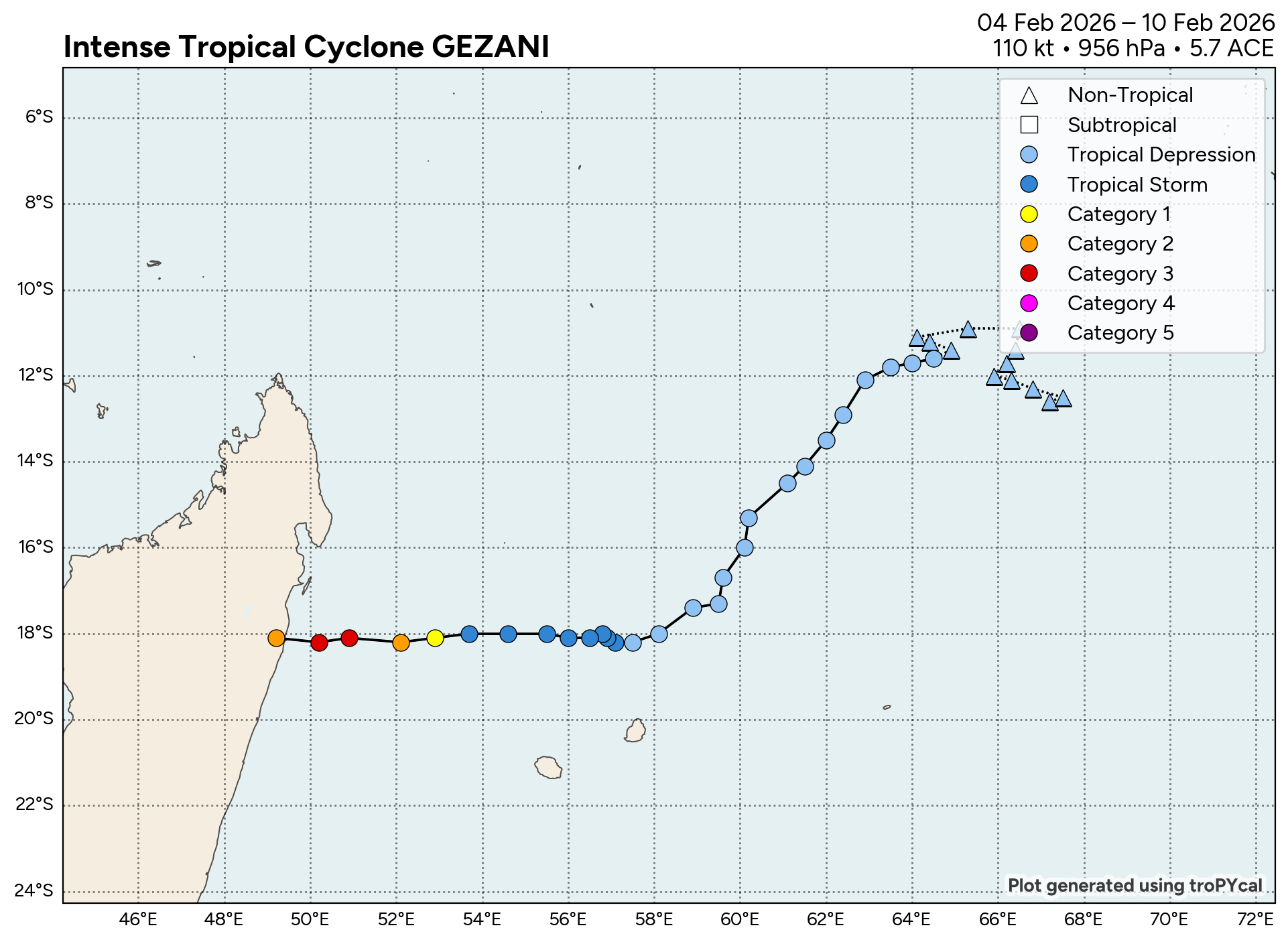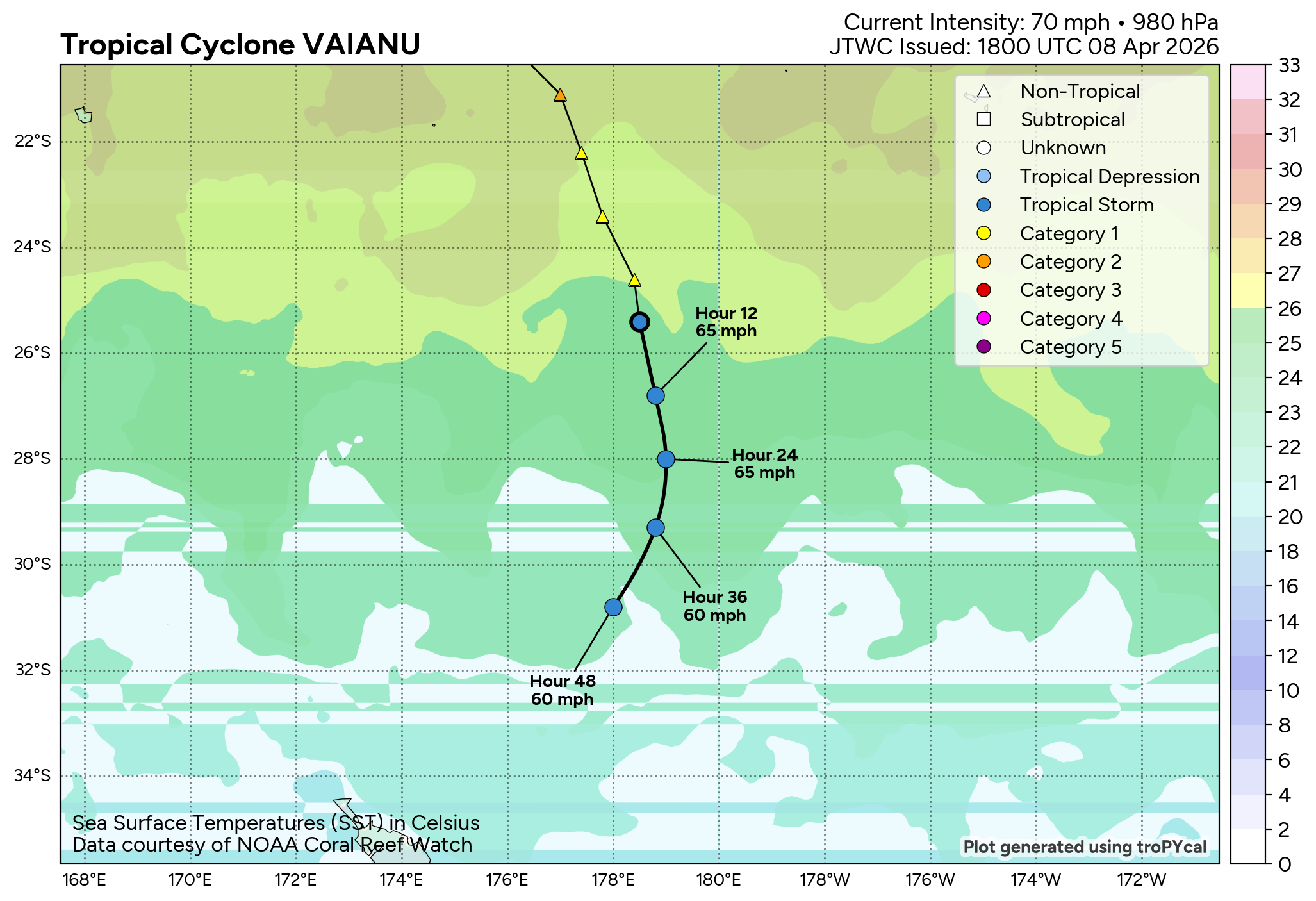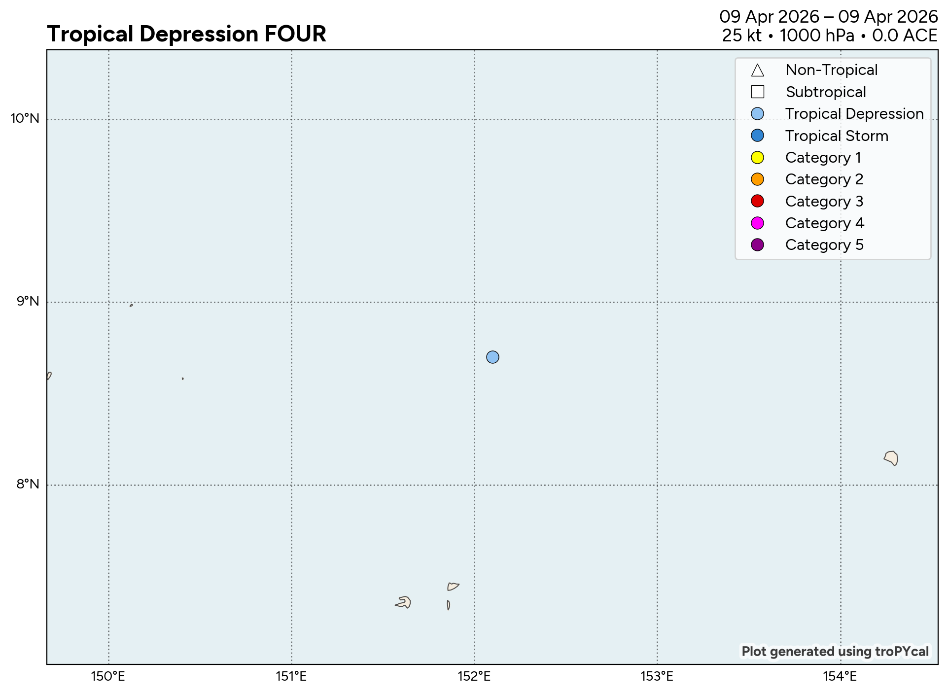 This page displays active tropical cyclones and invests, updated automatically using the Tropycal python package. Data is available courtesy of