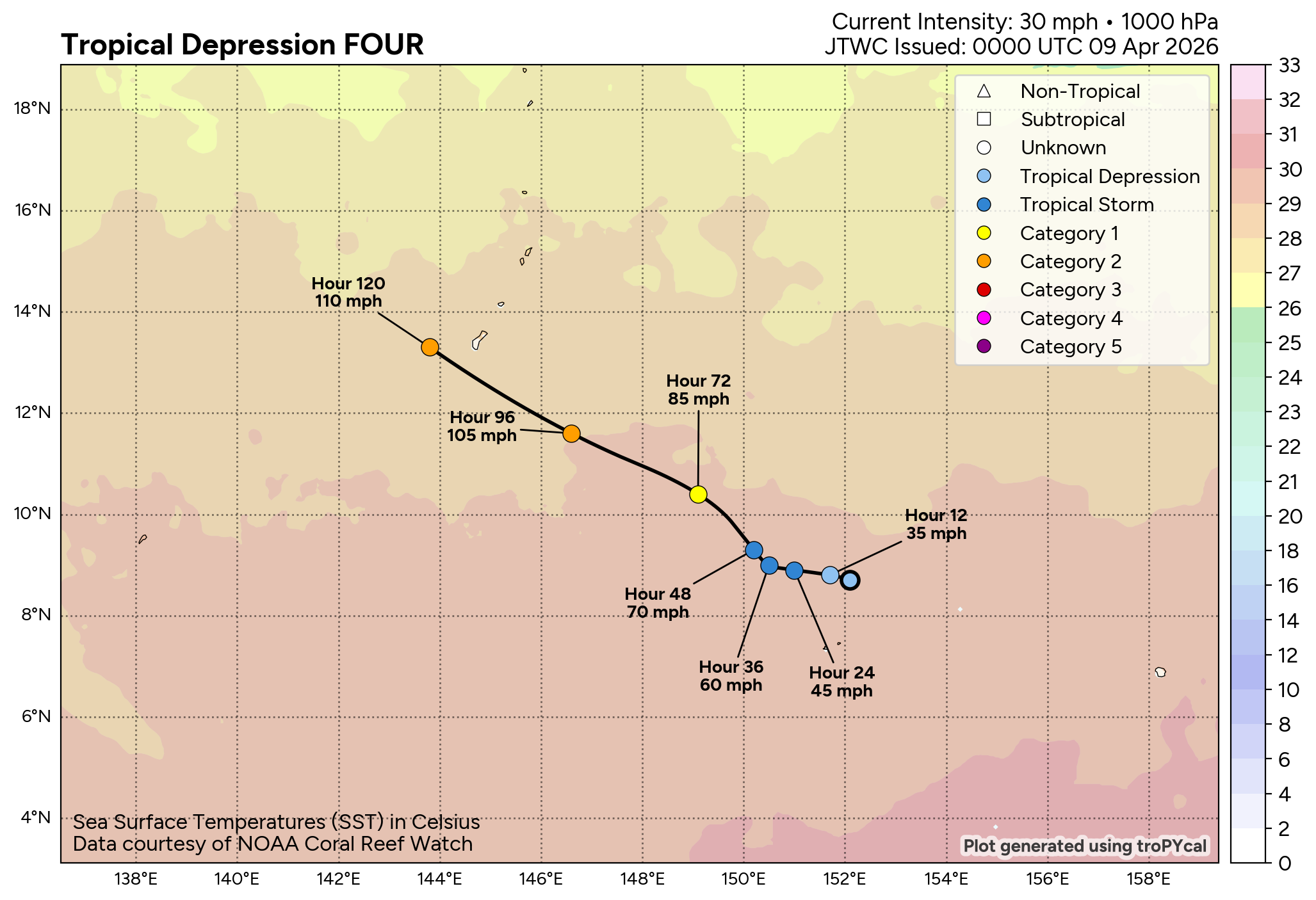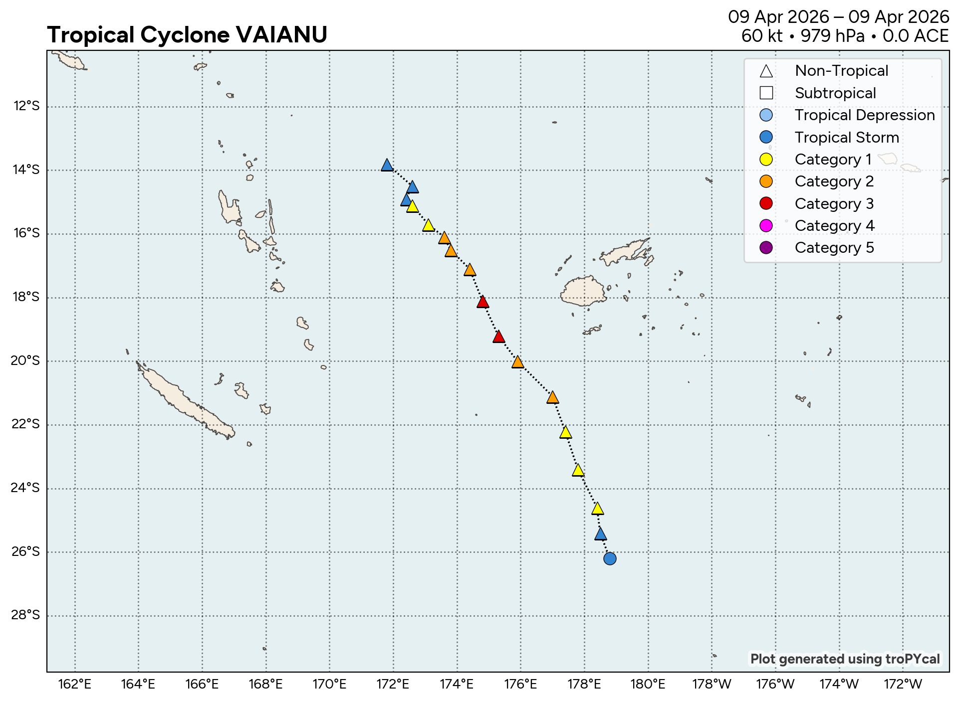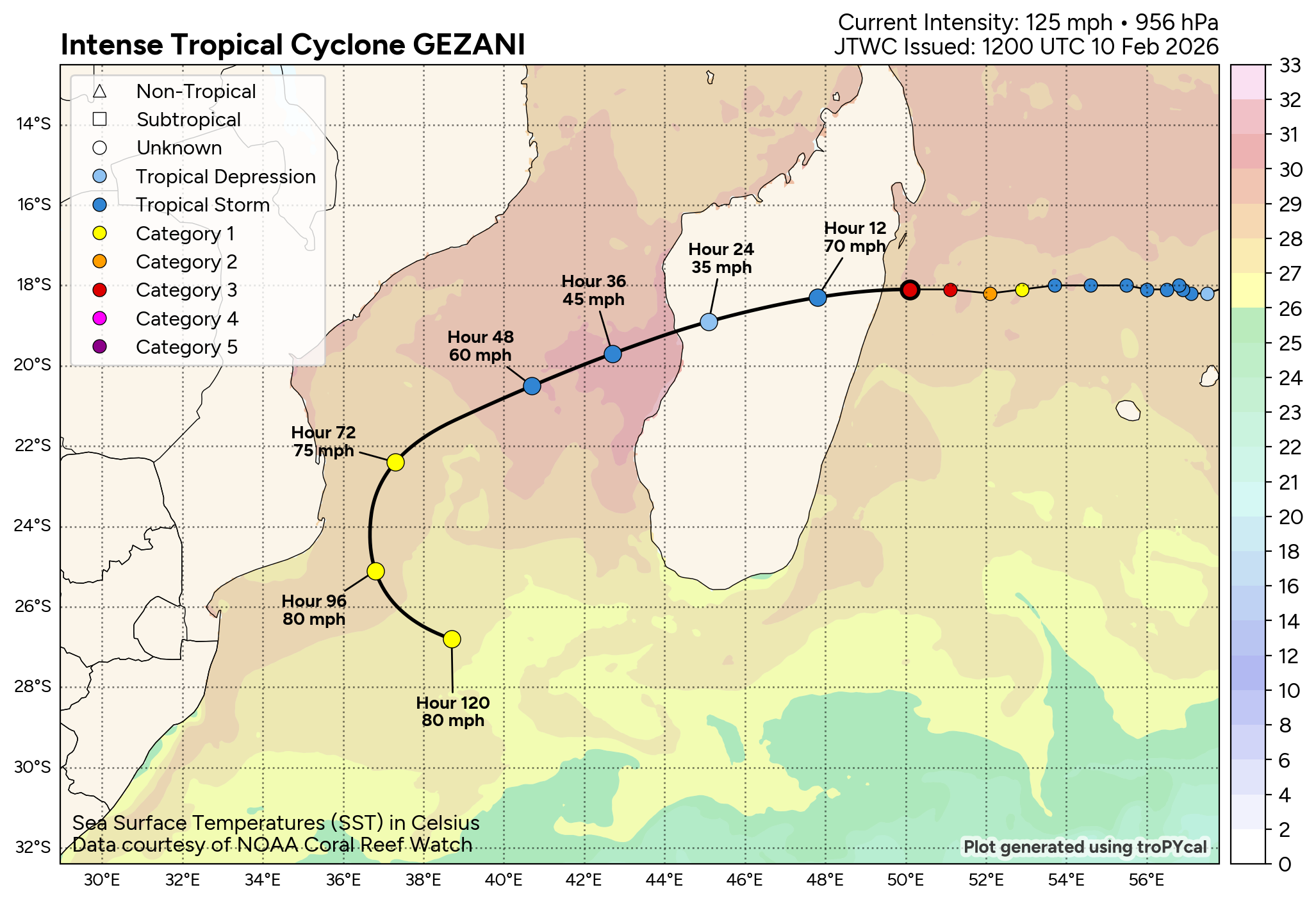 This page displays active tropical cyclones and invests, updated automatically using the Tropycal python package. Data is available courtesy of