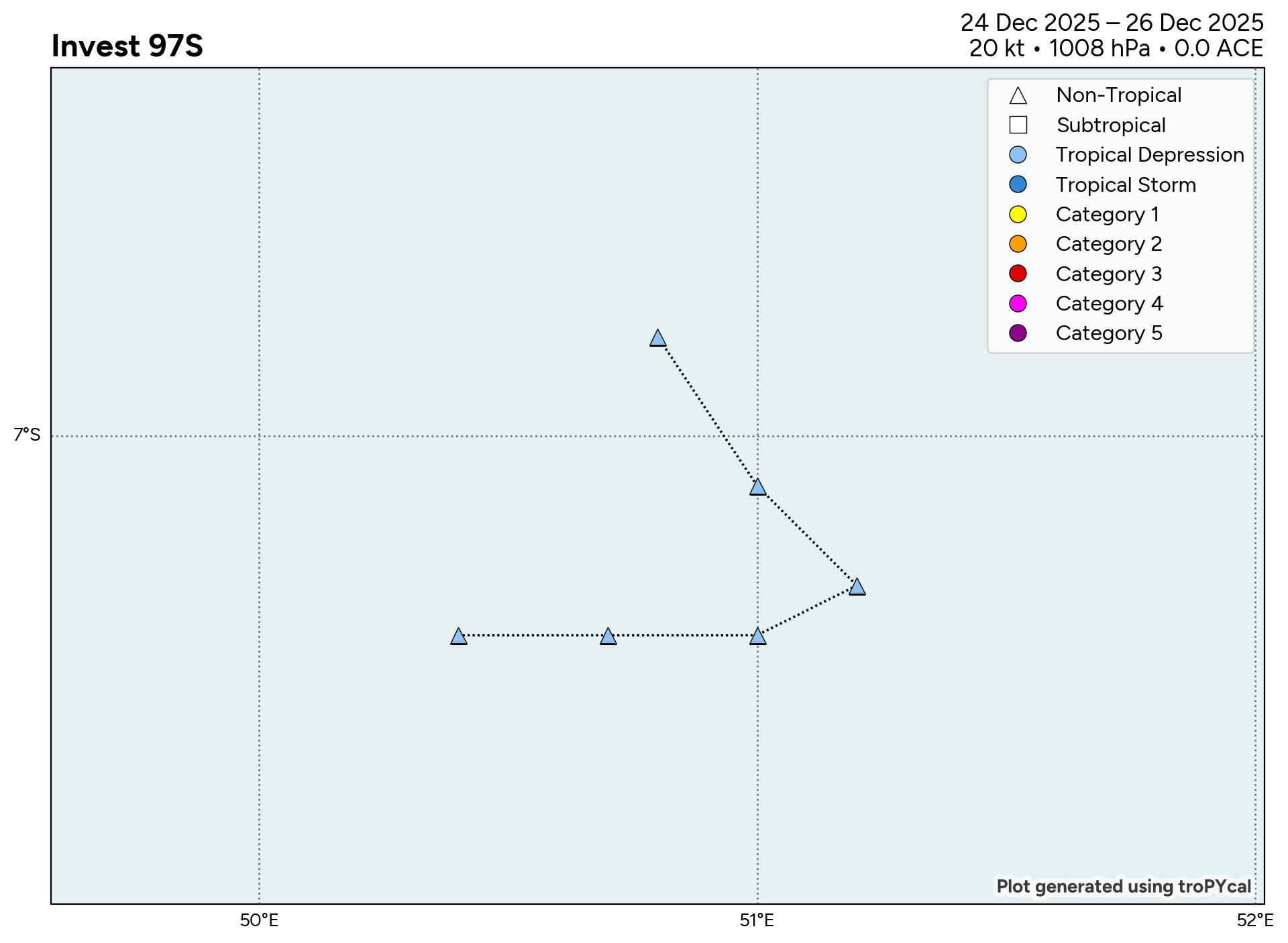 This page displays active tropical cyclones and invests, updated automatically using the Tropycal python package. Data is available courtesy of