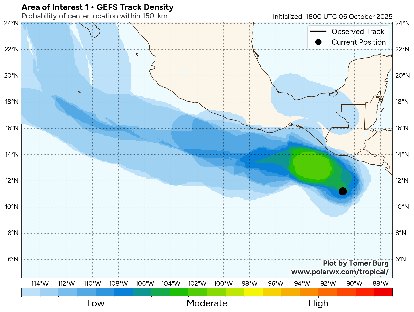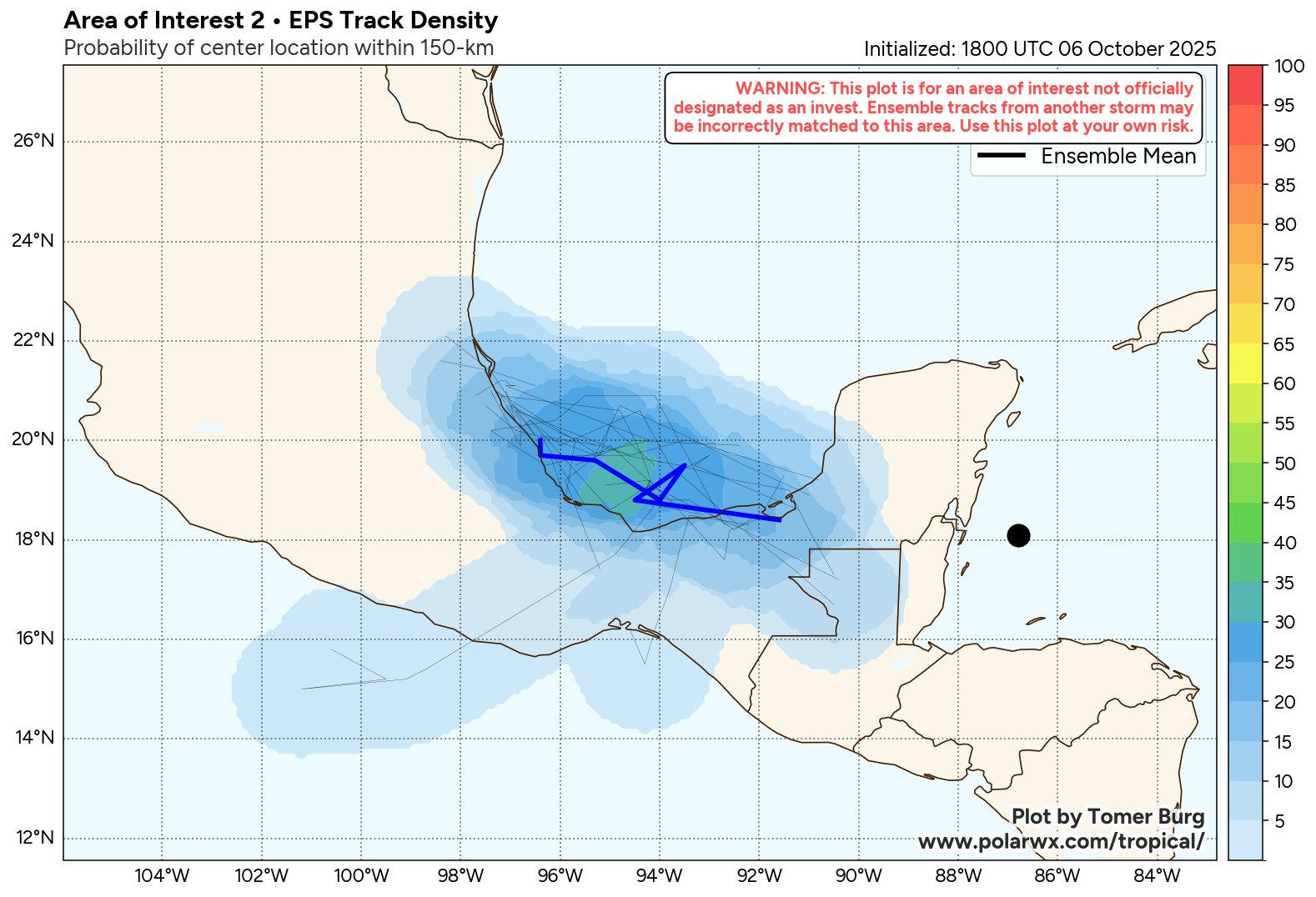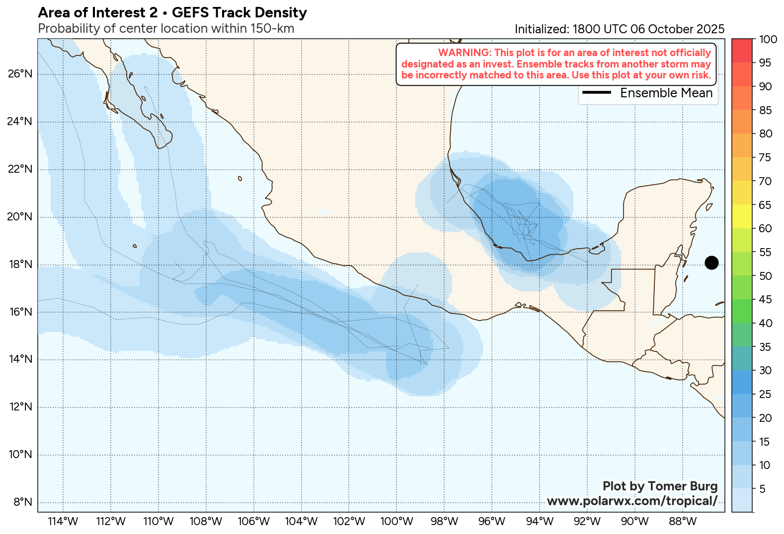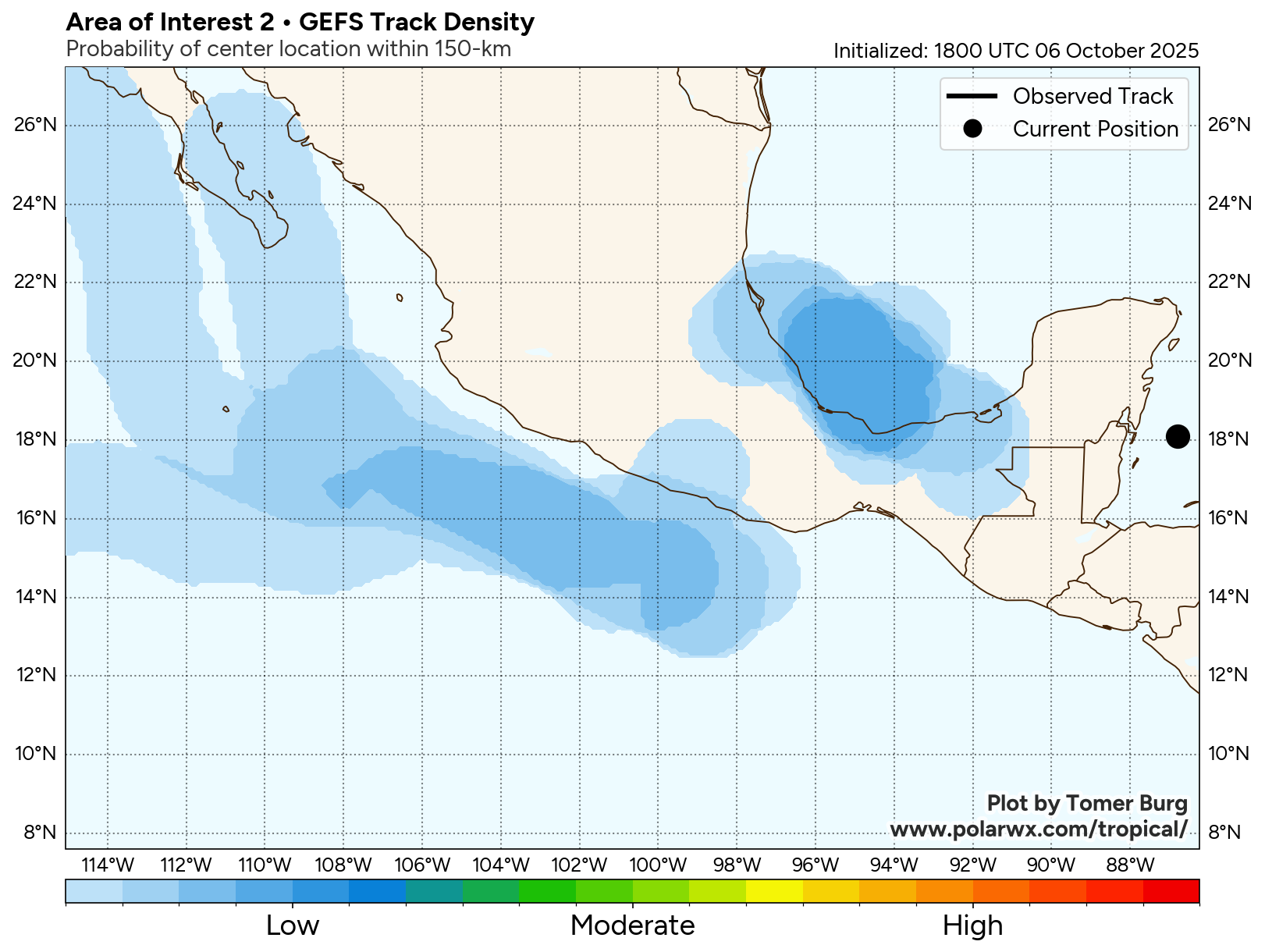 A trough of low pressure currently moving across the Yucatan Peninsula is expected to emerge into the Bay of Campeche during the day on Tuesday. The system is producing a large area of disorganized showers and thunderstorms, and some slow development of this system is possible over the Bay of Campeche before it moves inland by the middle portion of this week. Regardless of development, areas of heavy rain and gusty winds are likely across portions of the Yucatan Peninsula, Belize, and southern Mexico during the next few days.