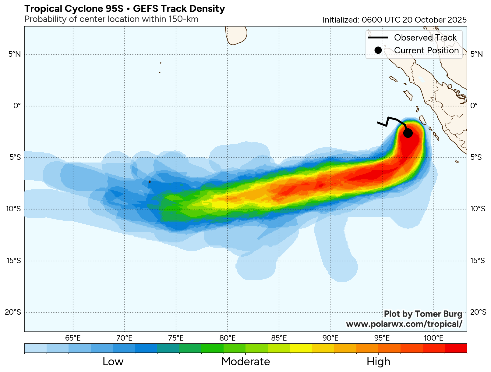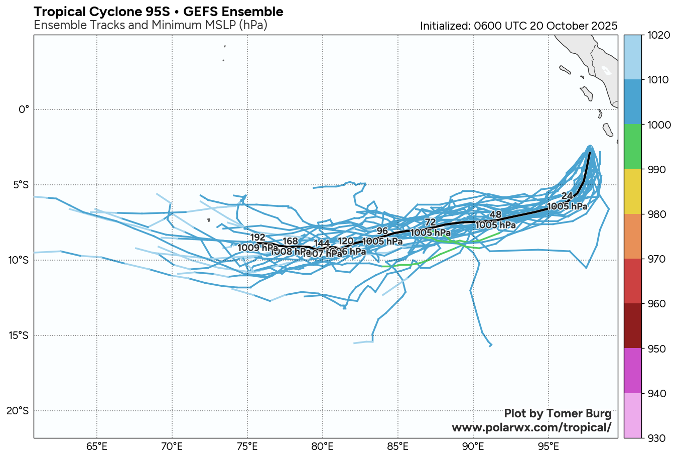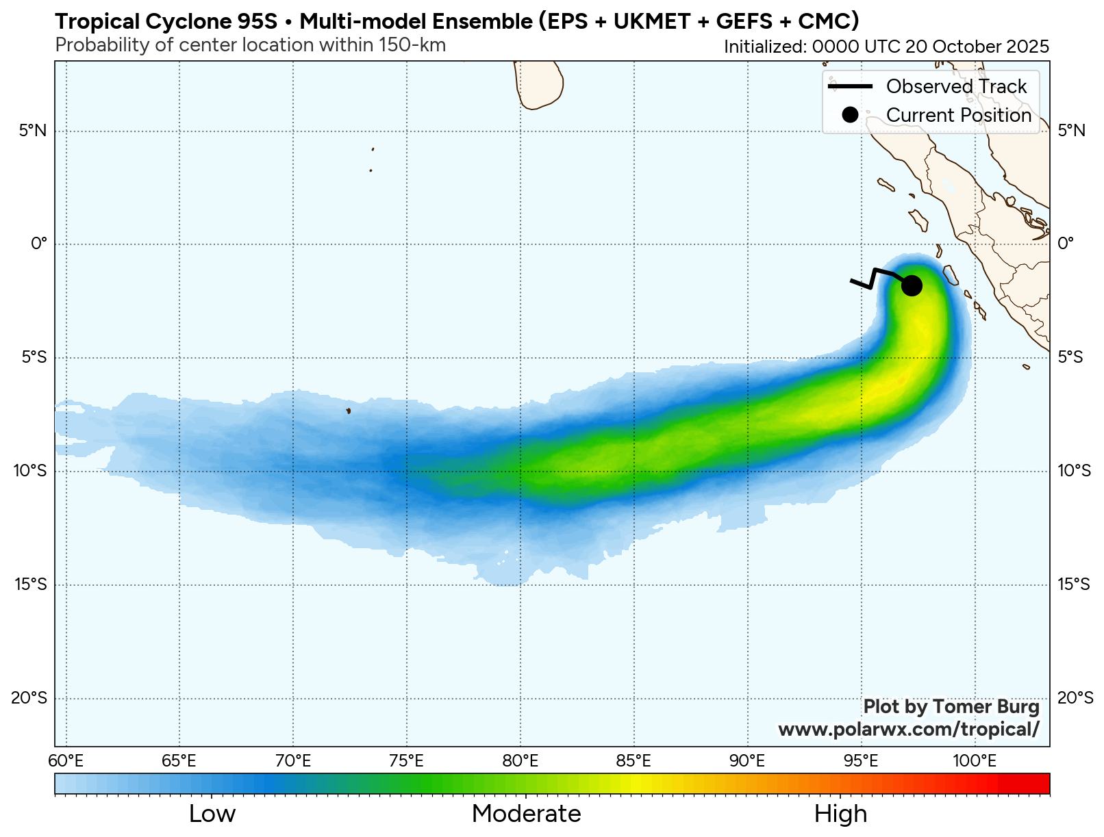 The area of convection (invest 95S) previously located near 1.1s 95.6E is now located near 1.0s 94.7E, approximately 686 nm north-northwest of the cocos islands. Animated multispectral imagery (MSI) depicts a poorly organized, broad circulation, with a rapidly consolidating low level circulation center (LLCC) embedded within the northern portion of the larger rotation. Deep convection can be seen flaring up near the LLCC, as well as across the southern side of the circulation. An ASCAT-B 200230z pass reveals a small, but well-defined, symmetrical LLCC with 25 knot winds wrapping around the majority of the circulation, with the highest winds present in the northeastern sector, trapped along the island offshore of western sumatra. Environmental analysis reveals marginal conditions for development with moderate to high vertical wind (20-25 knots), strong diffluent poleward outflow, and warm sea surface temperatures (29-30 c). Global models are in fair agreement that invest 95S will continue to have general steady development with a curving south to southwestern track within the next 24-48 hours.