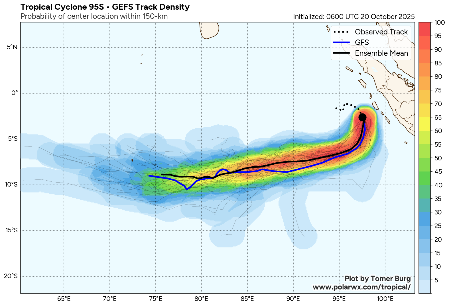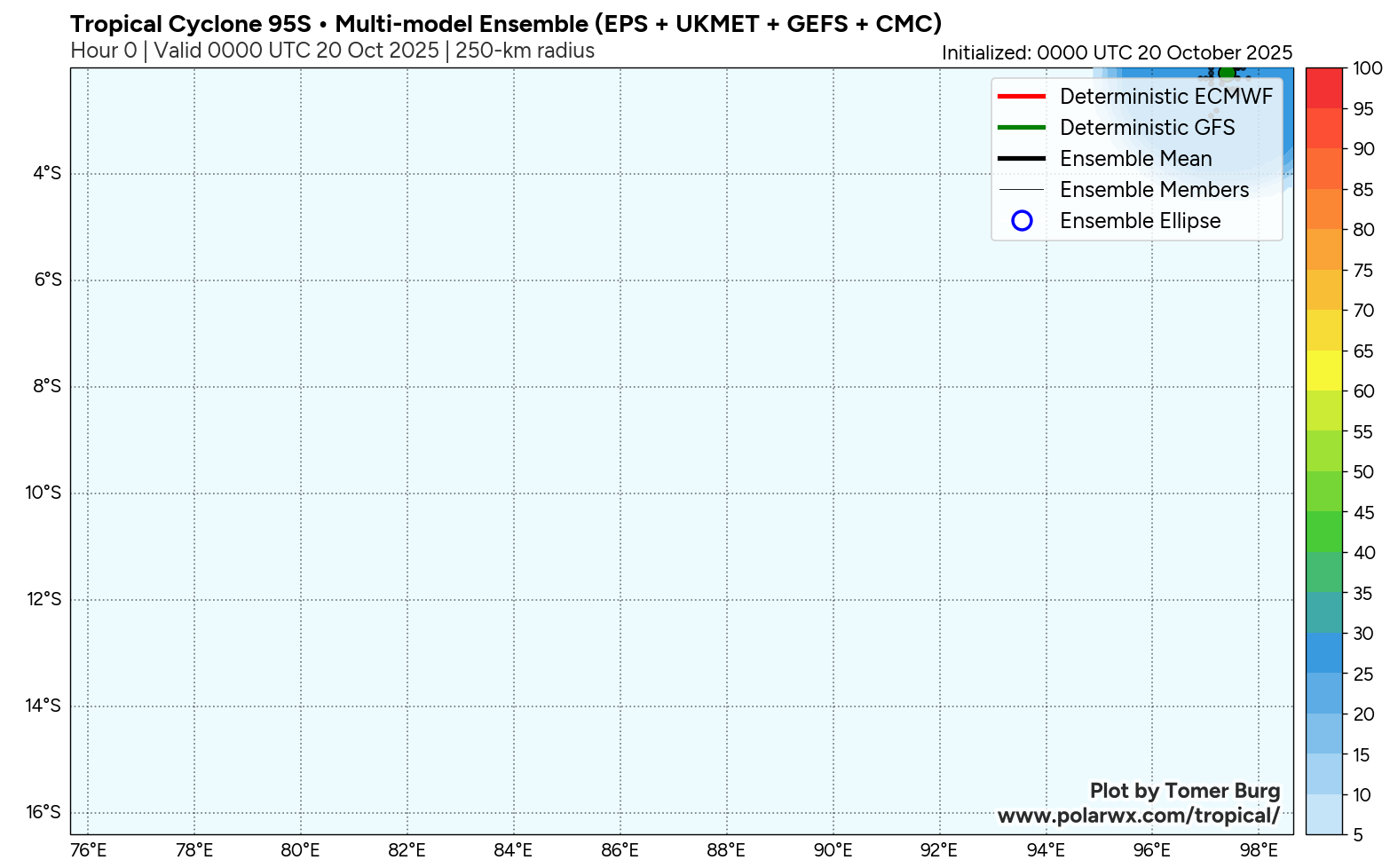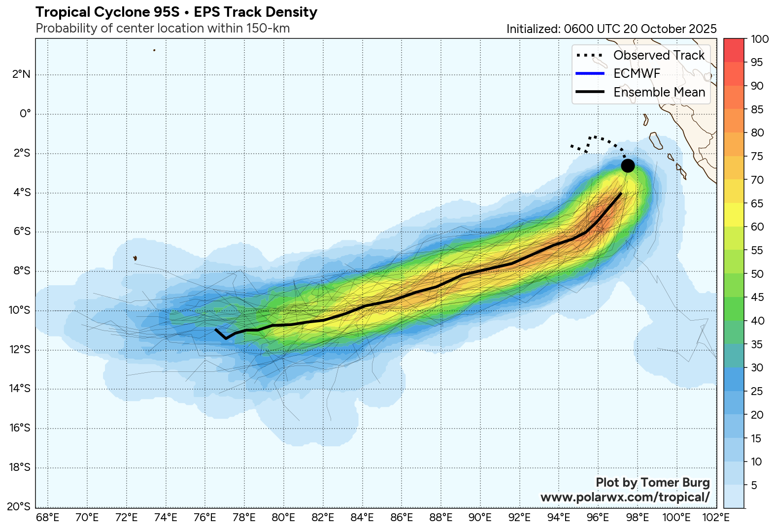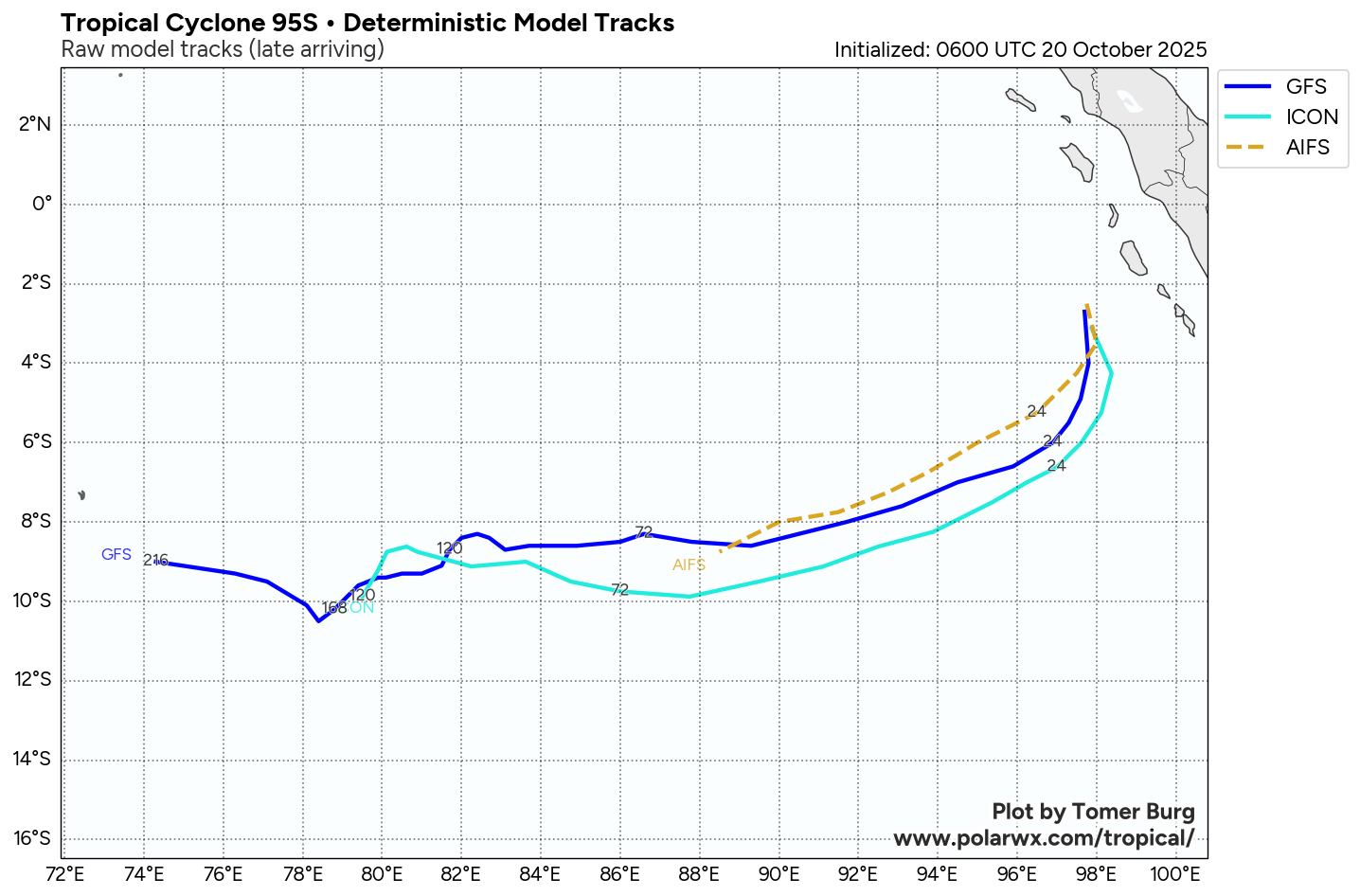 The area of convection (invest 95S) previously located near 1.1s 95.6E is now located near 1.0s 94.7E, approximately 686 nm north-northwest of the cocos islands. Animated multispectral imagery (MSI) depicts a poorly organized, broad circulation, with a rapidly consolidating low level circulation center (LLCC) embedded within the northern portion of the larger rotation. Deep convection can be seen flaring up near the LLCC, as well as across the southern side of the circulation. An ASCAT-B 200230z pass reveals a small, but well-defined, symmetrical LLCC with 25 knot winds wrapping around the majority of the circulation, with the highest winds present in the northeastern sector, trapped along the island offshore of western sumatra. Environmental analysis reveals marginal conditions for development with moderate to high vertical wind (20-25 knots), strong diffluent poleward outflow, and warm sea surface temperatures (29-30 c). Global models are in fair agreement that invest 95S will continue to have general steady development with a curving south to southwestern track within the next 24-48 hours.