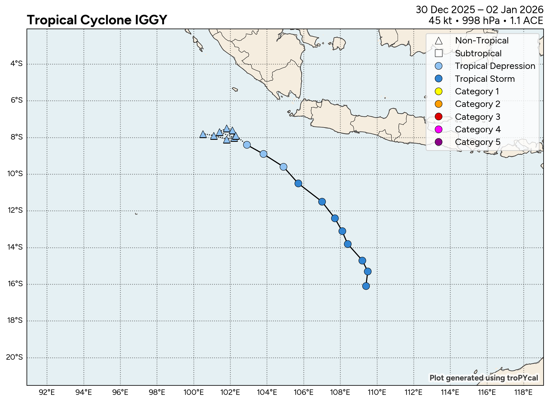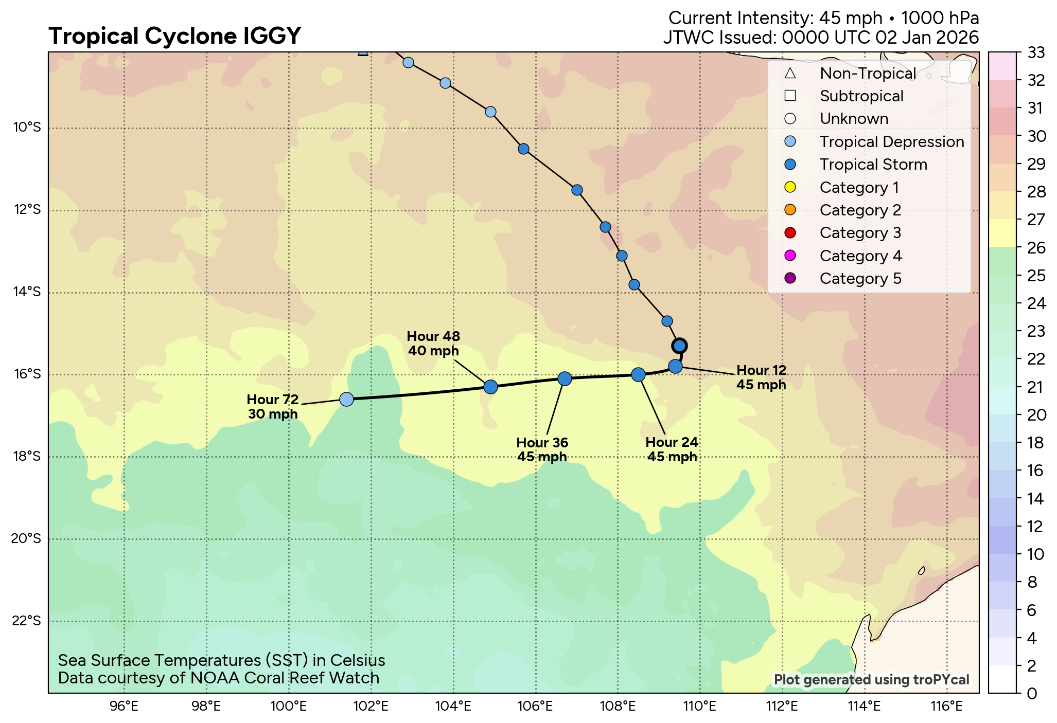 This page displays active tropical cyclones and invests, updated automatically using the Tropycal python package. Data is available courtesy of