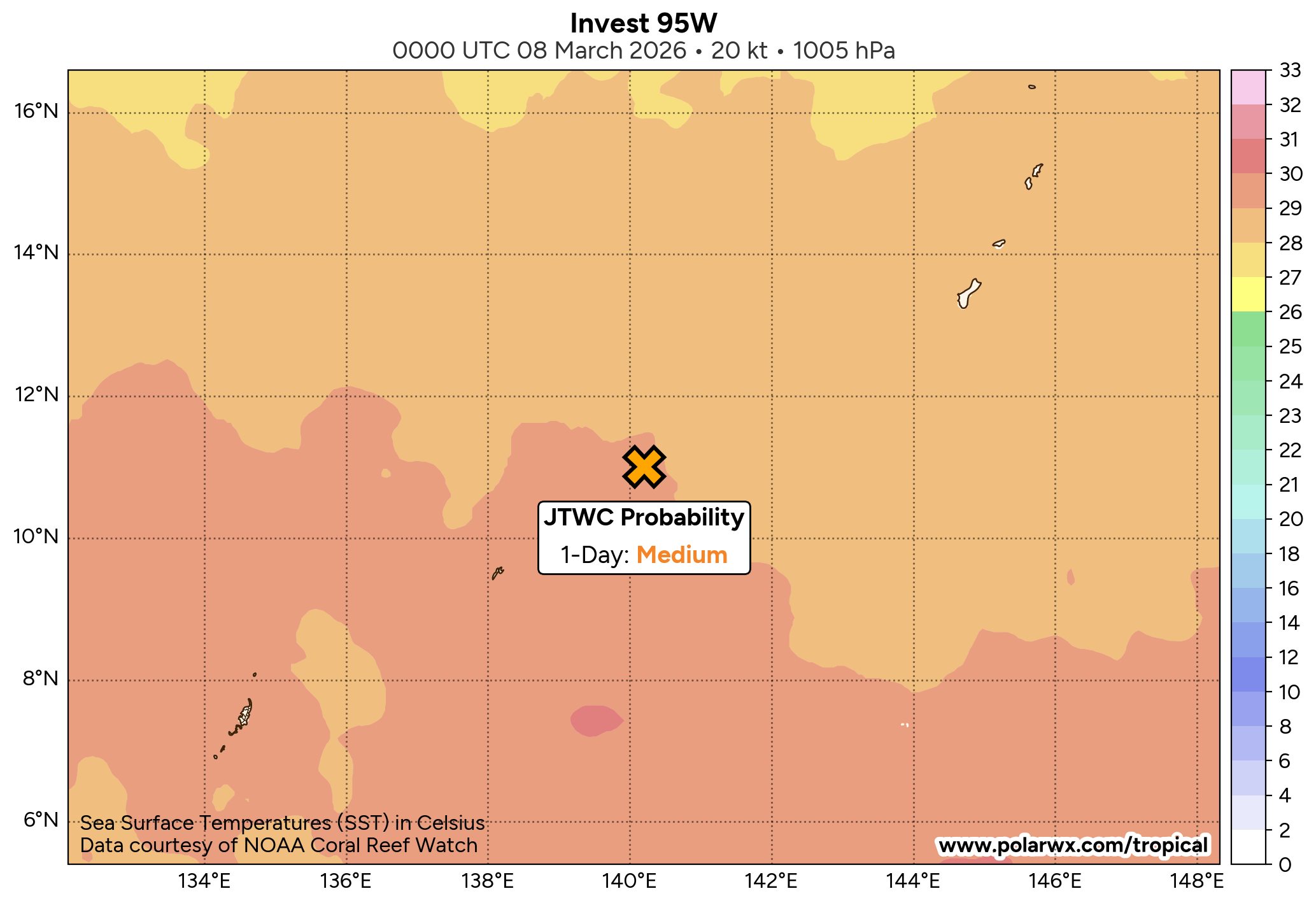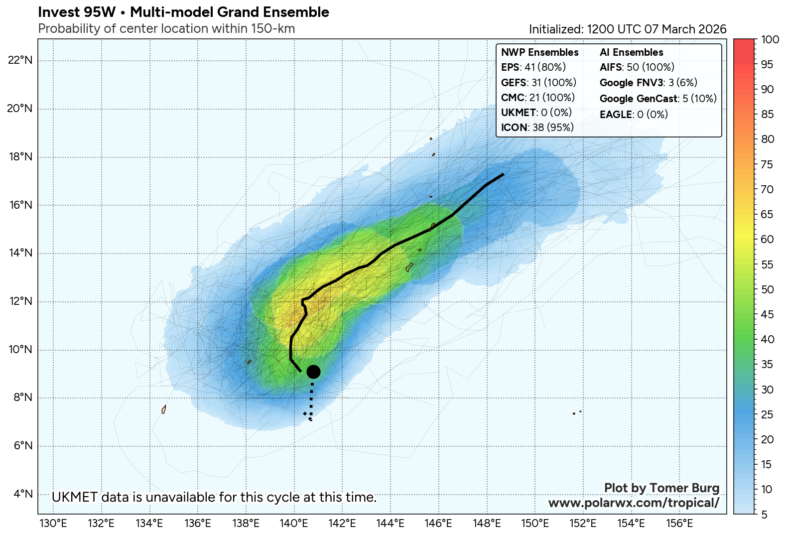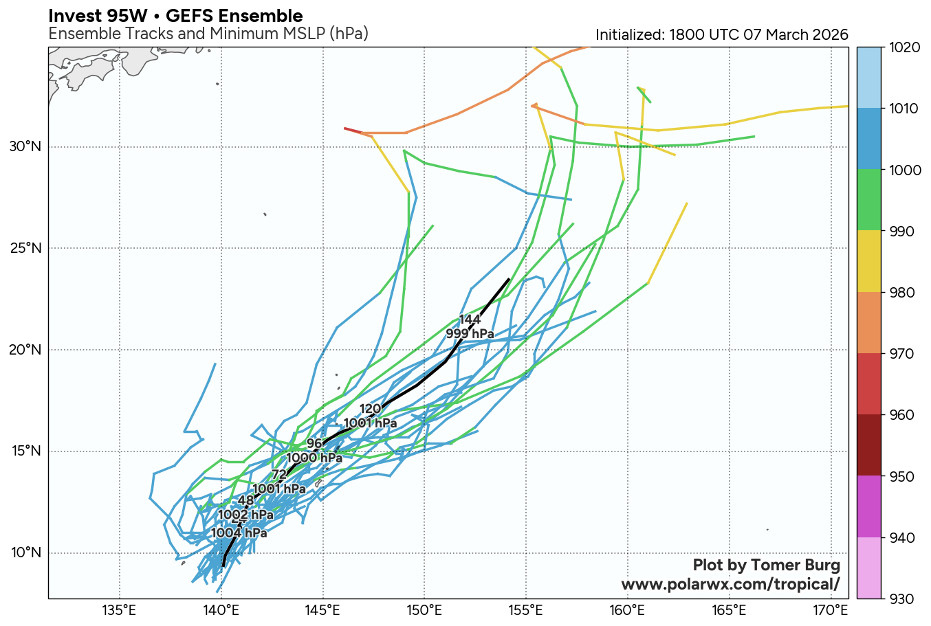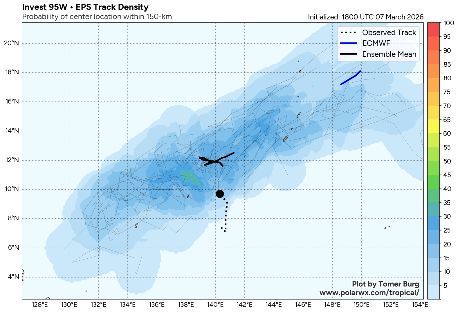The area of convection (invest 95W) previously located near 7.1n 140.7E is now located near 8.5n 140.7E, approximately 164 nm east-southeast of Yap. Animated multispectral satellite imagery depicts broad turning with disorganized convection. Environmental analysis reveals a marginally favorable environment for development with moderate poleward upper-level outflow, low to moderate vertical wind shear (15-20 kts), and warm sea surface temperatures (29-30 c). Global ensemble models are hesitant in the formation of 95W with individual ensemble members being scattered. The deterministic models are similarly scattered with GFS being the most aggressive in terms of development. Models generally agree on the system maintaining an elongated wind field as it tracks near the marianas islands over the next 24-48 hours.