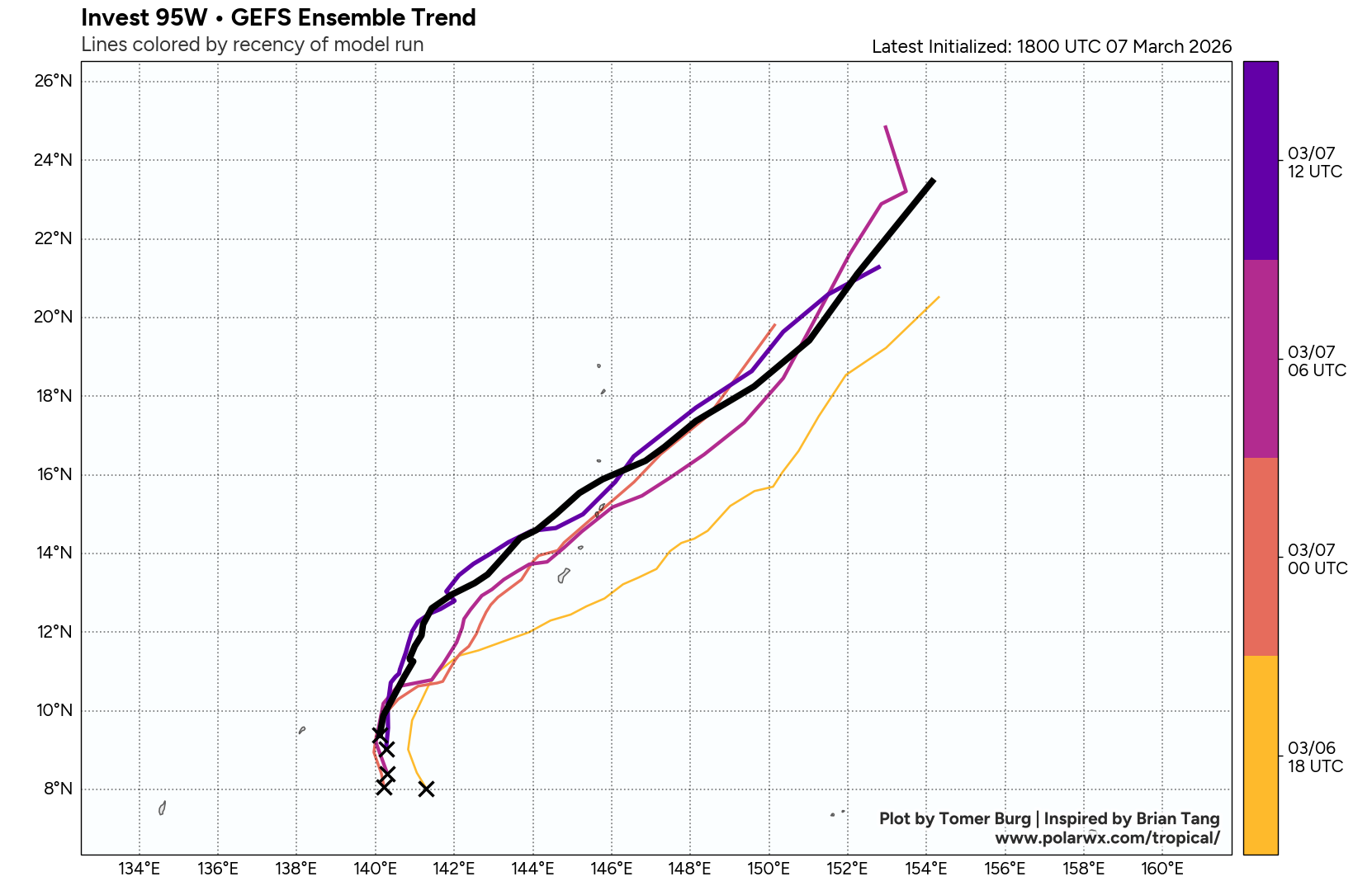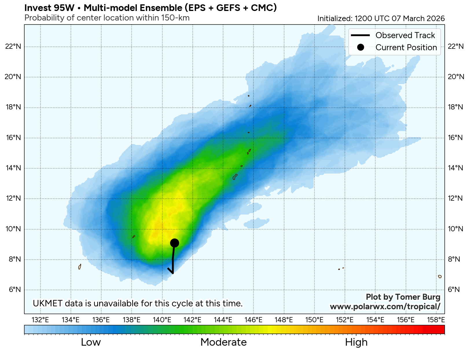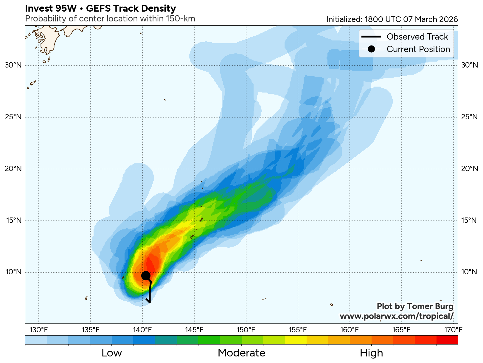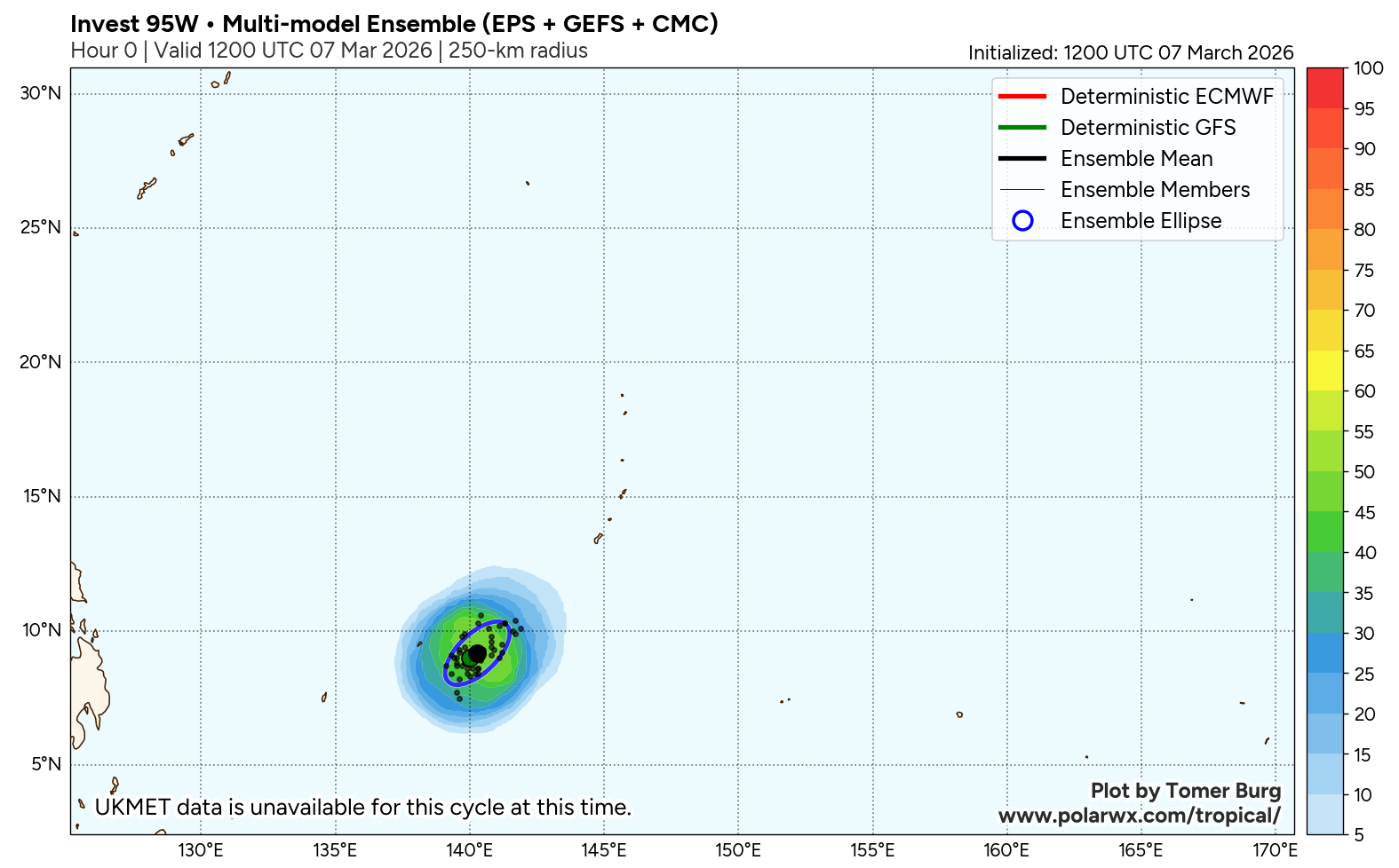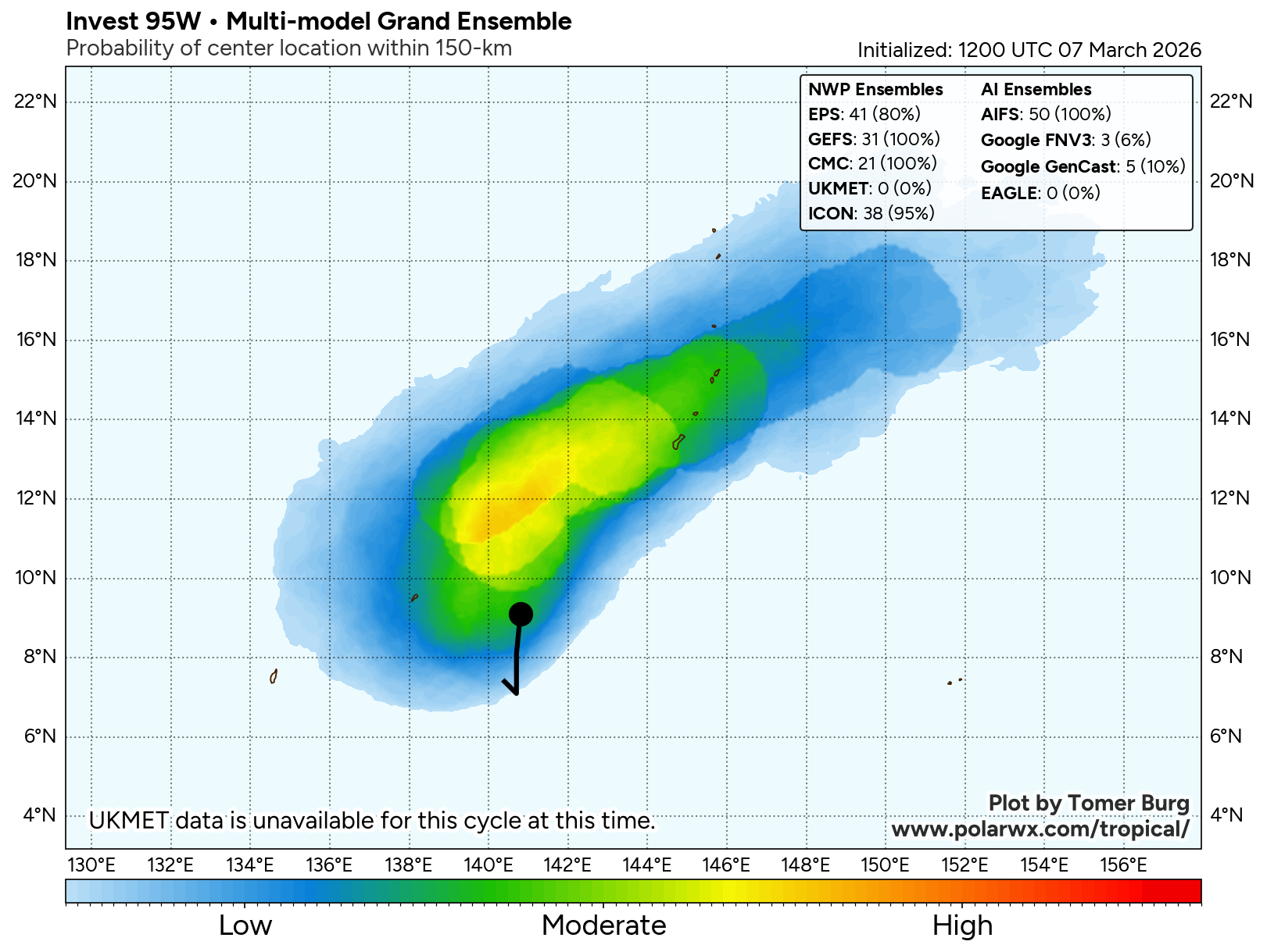The area of convection (invest 95W) previously located near 7.1n 140.7E is now located near 8.5n 140.7E, approximately 164 nm east-southeast of Yap. Animated multispectral satellite imagery depicts broad turning with disorganized convection. Environmental analysis reveals a marginally favorable environment for development with moderate poleward upper-level outflow, low to moderate vertical wind shear (15-20 kts), and warm sea surface temperatures (29-30 c). Global ensemble models are hesitant in the formation of 95W with individual ensemble members being scattered. The deterministic models are similarly scattered with GFS being the most aggressive in terms of development. Models generally agree on the system maintaining an elongated wind field as it tracks near the marianas islands over the next 24-48 hours.